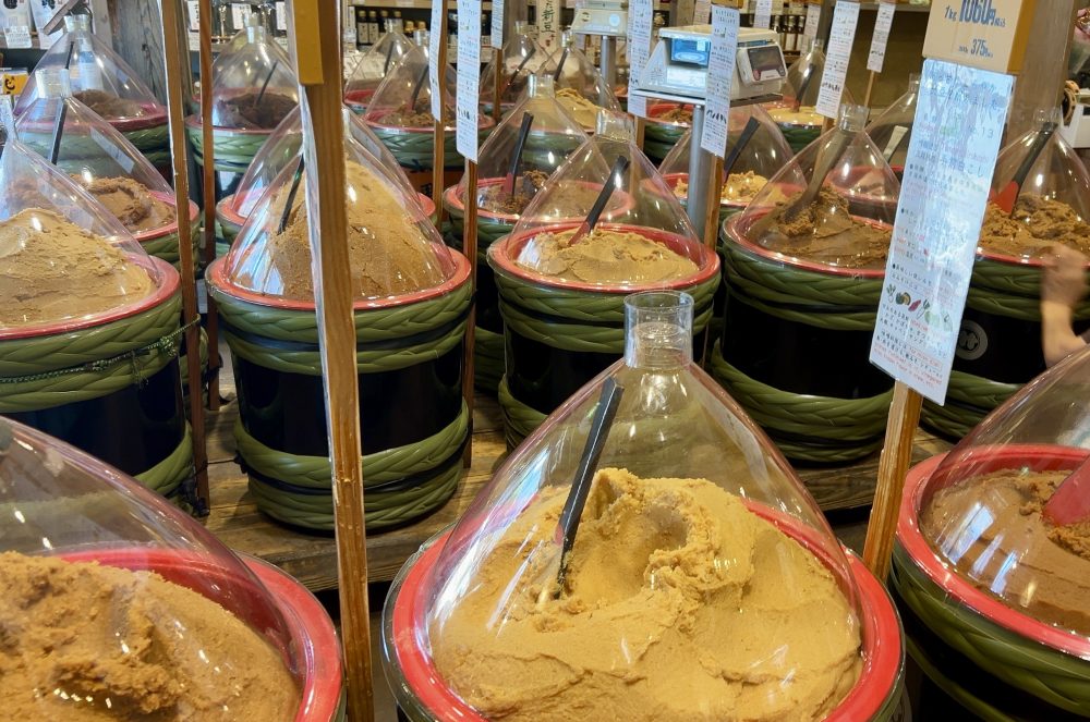 店内には味噌樽がずらりと並んでいて、なんと味噌の種類は70種以上。各地方のお味噌はもちろんのこと、味噌味のスイーツから漬物までいろんなものが豊富に取り揃えられていて、ワクワクがとまりません。