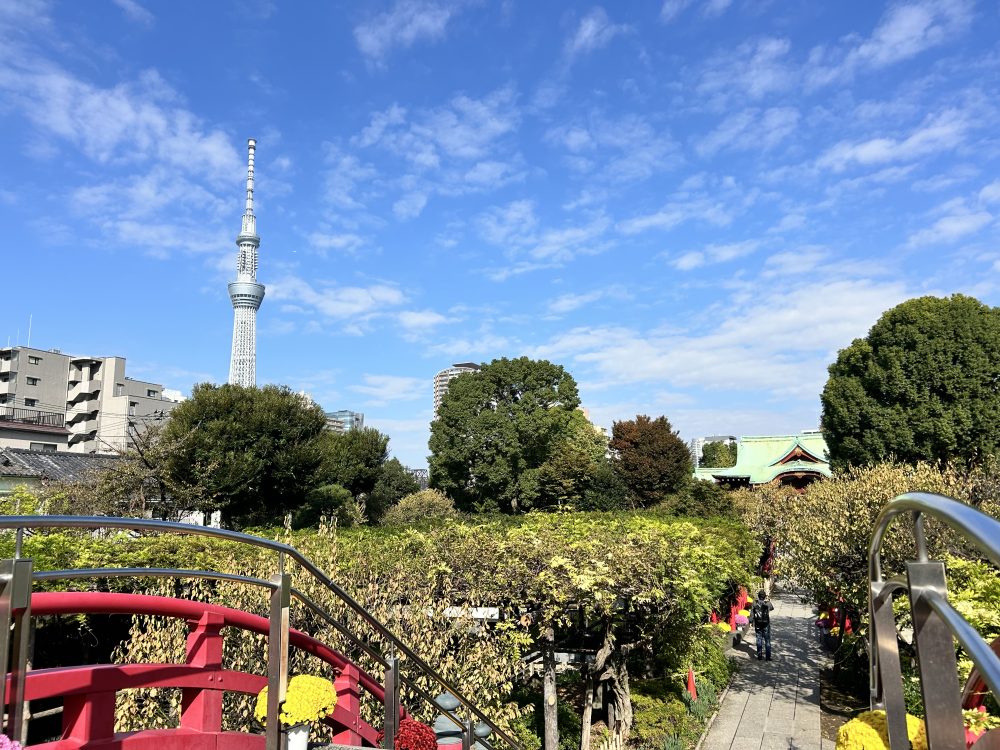 気持ちのいい秋晴れの日。どこか神社巡りに行きたいなぁと調べていたら、ふと目に飛び込んできたのは、亀戸天神の綺麗な朱塗りの拝殿とその背後にそびえたつスカイツリーの写真でした。青い空のもとでこの景色が見てみたい!と思い立ち、学問の神様で有名な亀戸天神社にご挨拶に行ってきました。