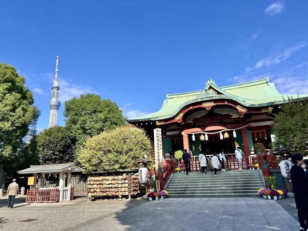ついに見たかったあの写真の光景が。。青空に朱塗りの拝殿とスカイツリー!こんな街中なのに、他に建物が映り込まないのが奇跡的ですよね。