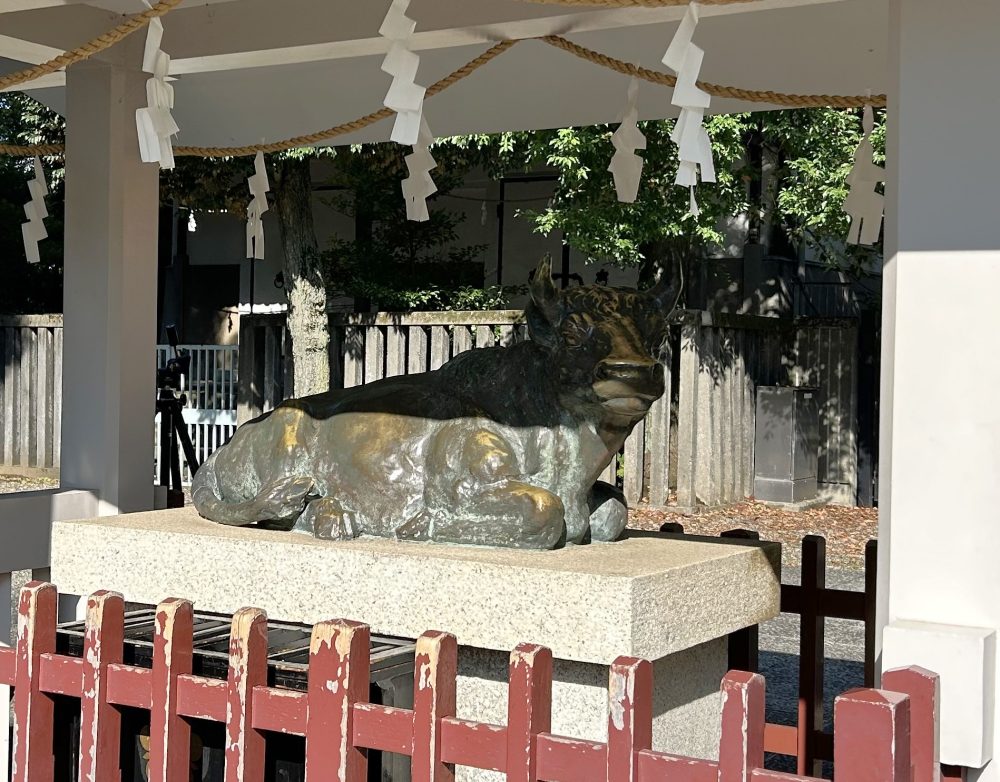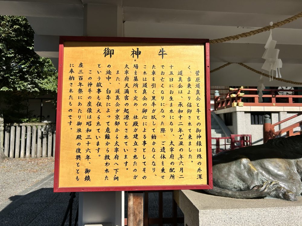 拝殿の左手には、牛の像があります。道真公の話に牛は欠かすことが出来ない存在で、天神の神使でもあります。