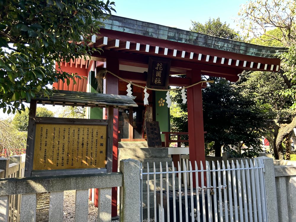 御嶽神社を鳥居側に進むと、右手の心字池の淵に花園社が鎮座しています。