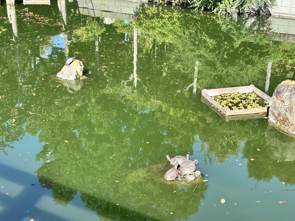 心字池にはたくさんの亀がいます。天気の良かったこの日も岩の上に登って日向ぼっこをしていました。
