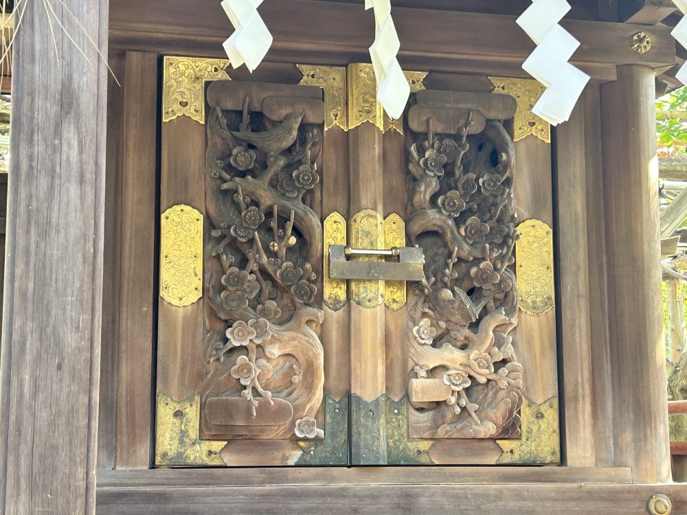 と和歌を詠むと、この歌を聞いた梅の木が、慕っていた道真が太宰府に到着した日、一夜にうちに京から太宰府へ飛んで来たという有名な「飛梅伝説」があります。その「飛梅」の実生(みしょう)をお祀りしたお社だそうです。扉には見事な梅の彫刻が施されていました。