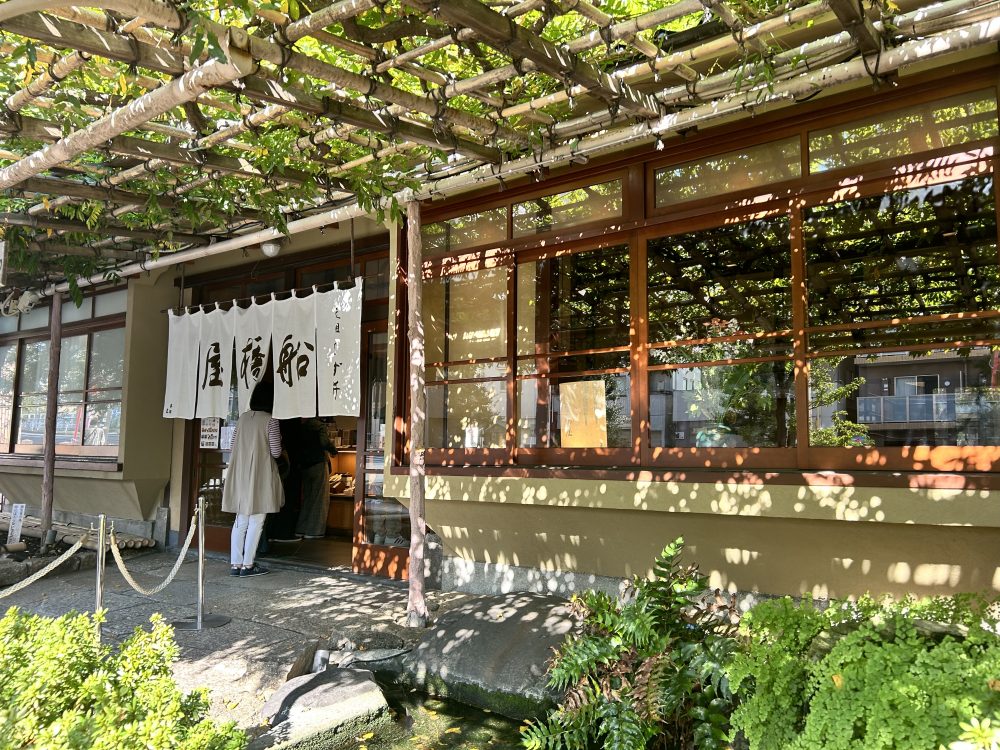 亀戸天神社から徒歩1分にある「船橋屋」さん。創業1805年の発酵和菓子「くず餅・あんみつ」の老舗です。店の門には、立派な鯉も泳いでいて風流な佇まいです。